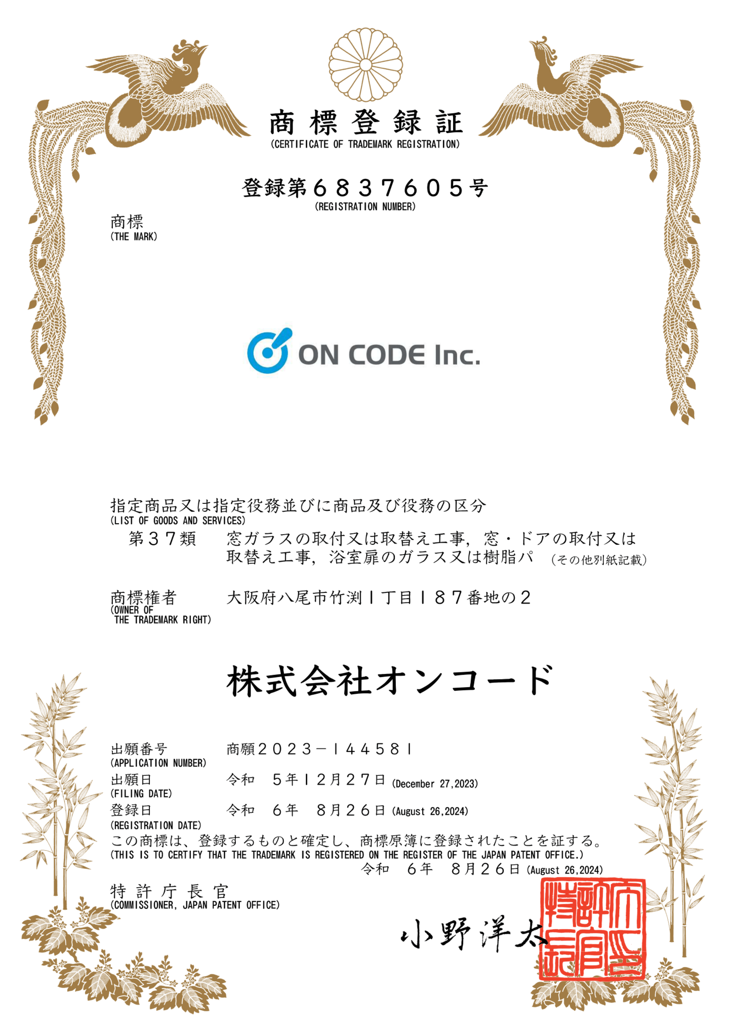 | 2012年7月 | ・大阪府八尾市にてガラス施工会社 株式会社オンコード設立 |