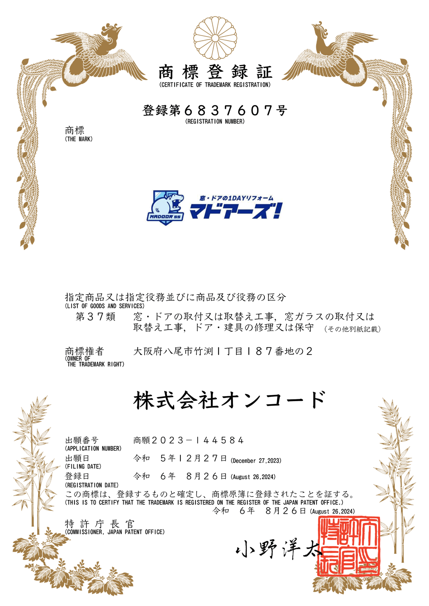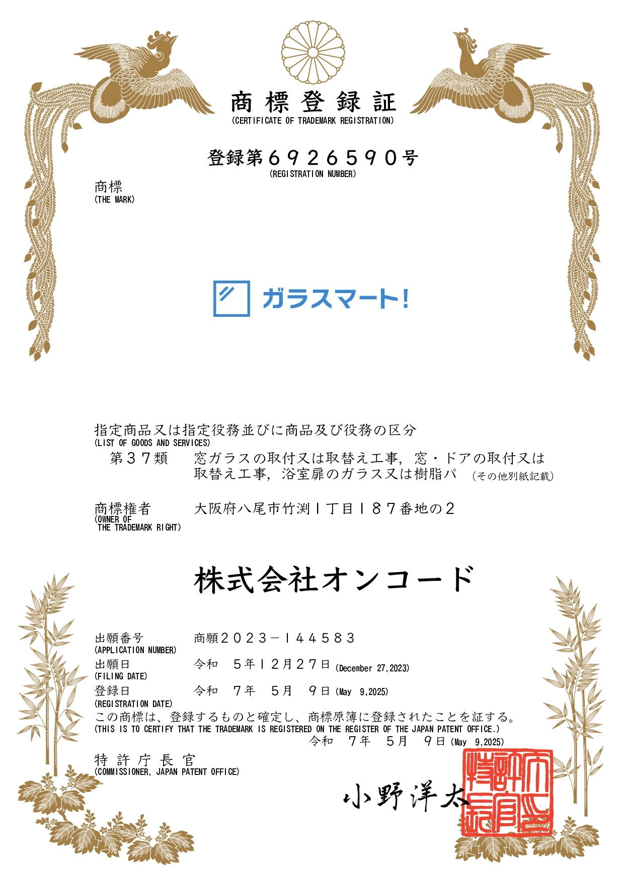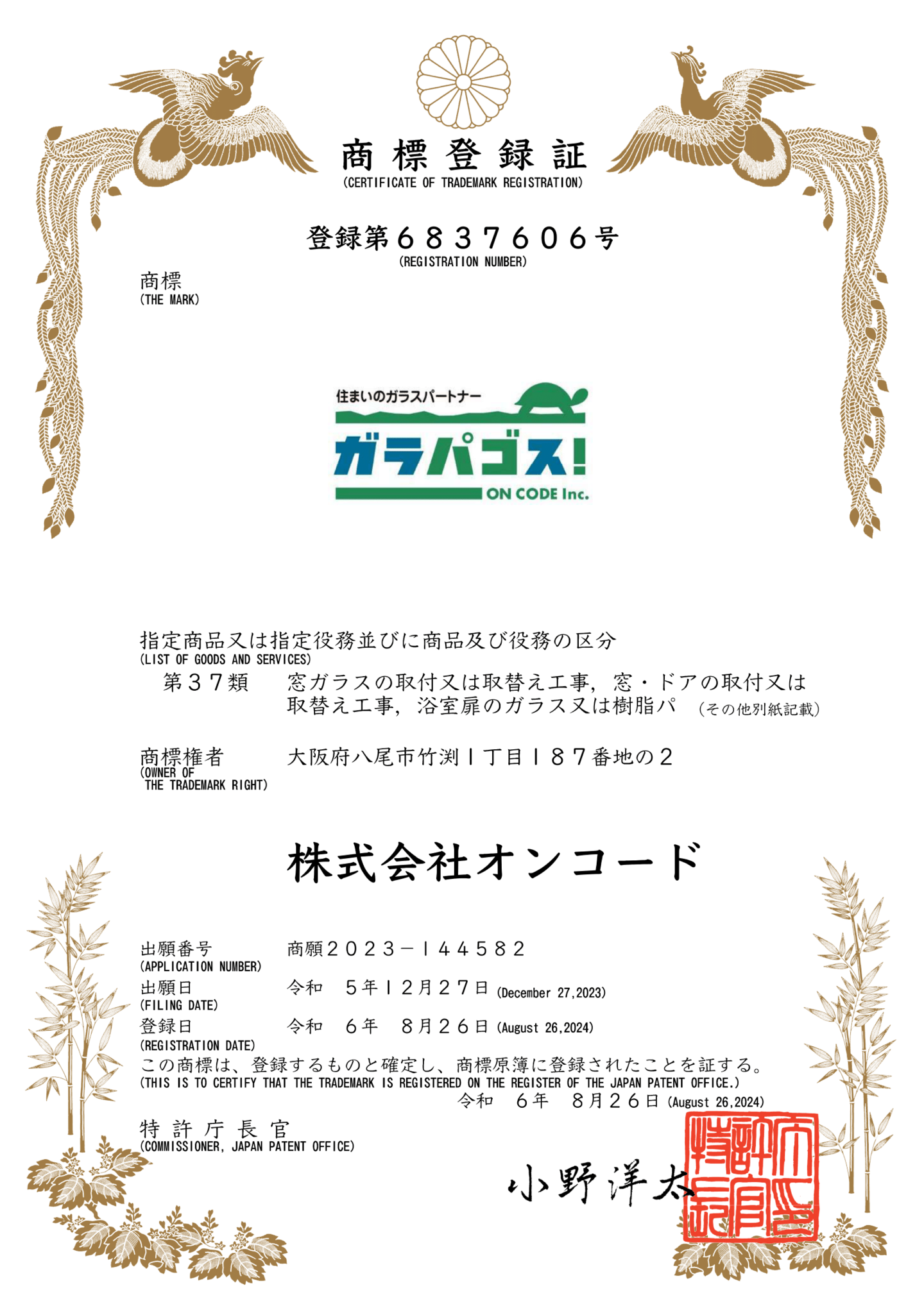 | 商標登録 | 株式会社オンコード(登録第6837605号) ガラパゴス!(登録第6837606号) マドアーズ!(登録第6837607号) ガラスマート!(登録第6926590号) |